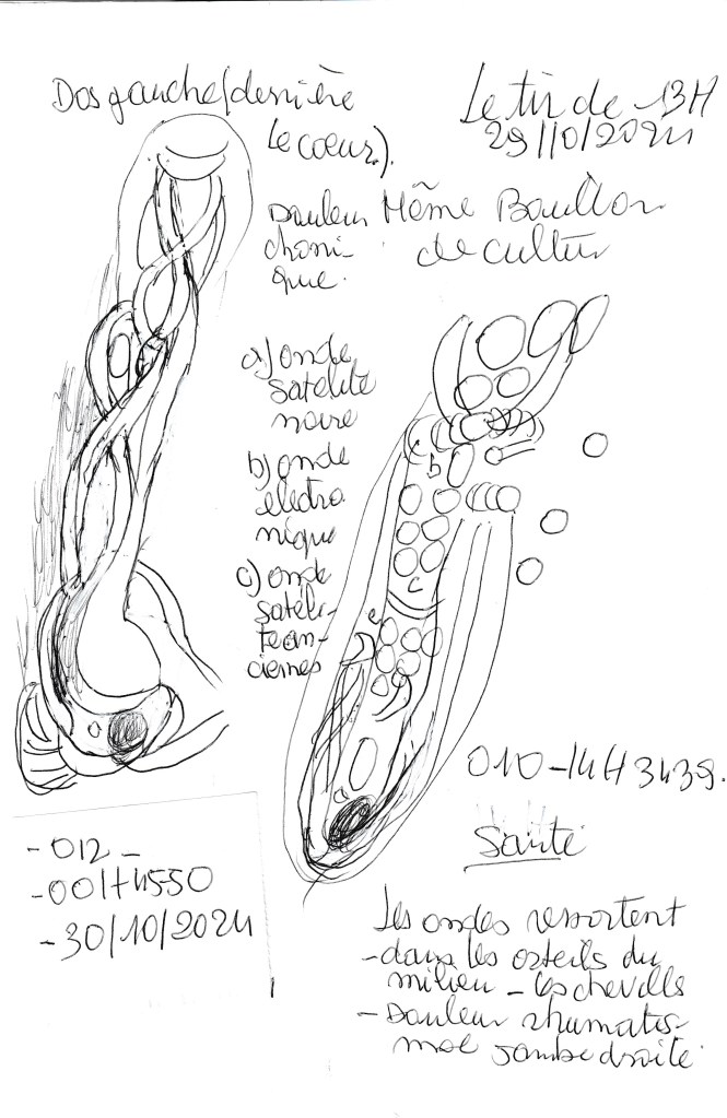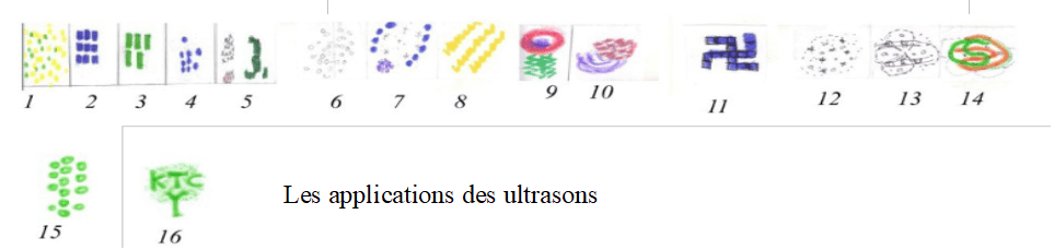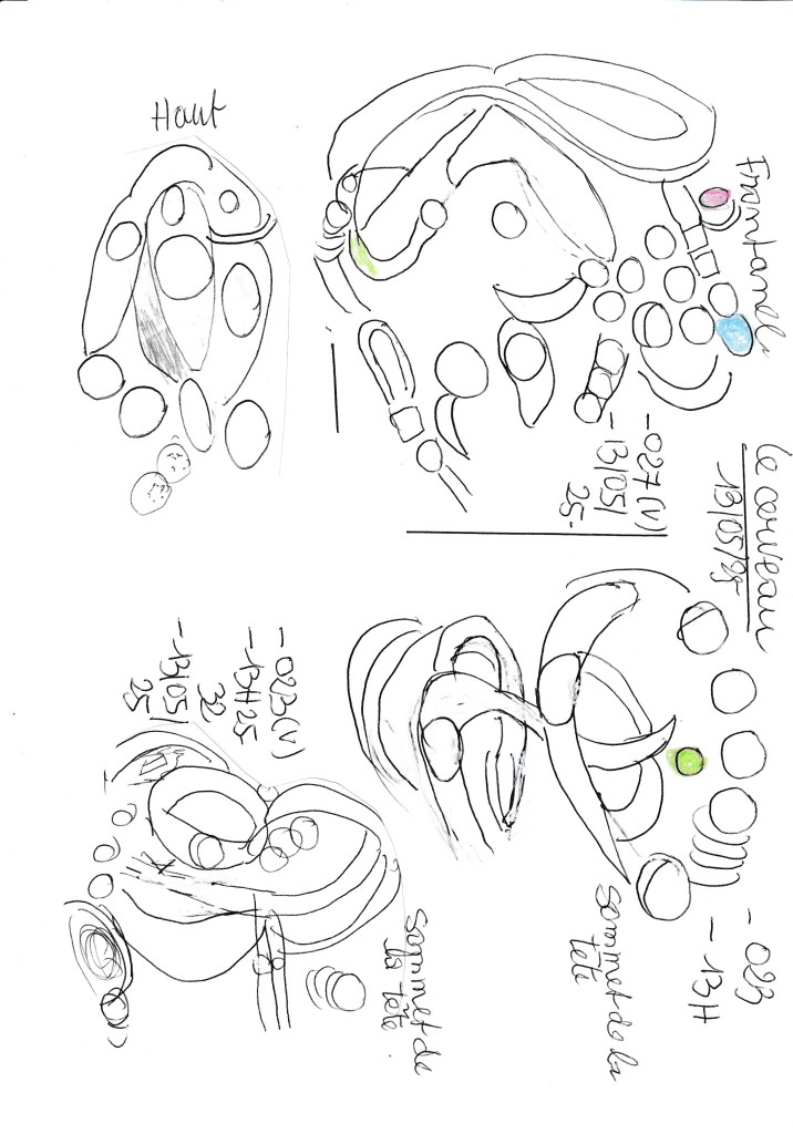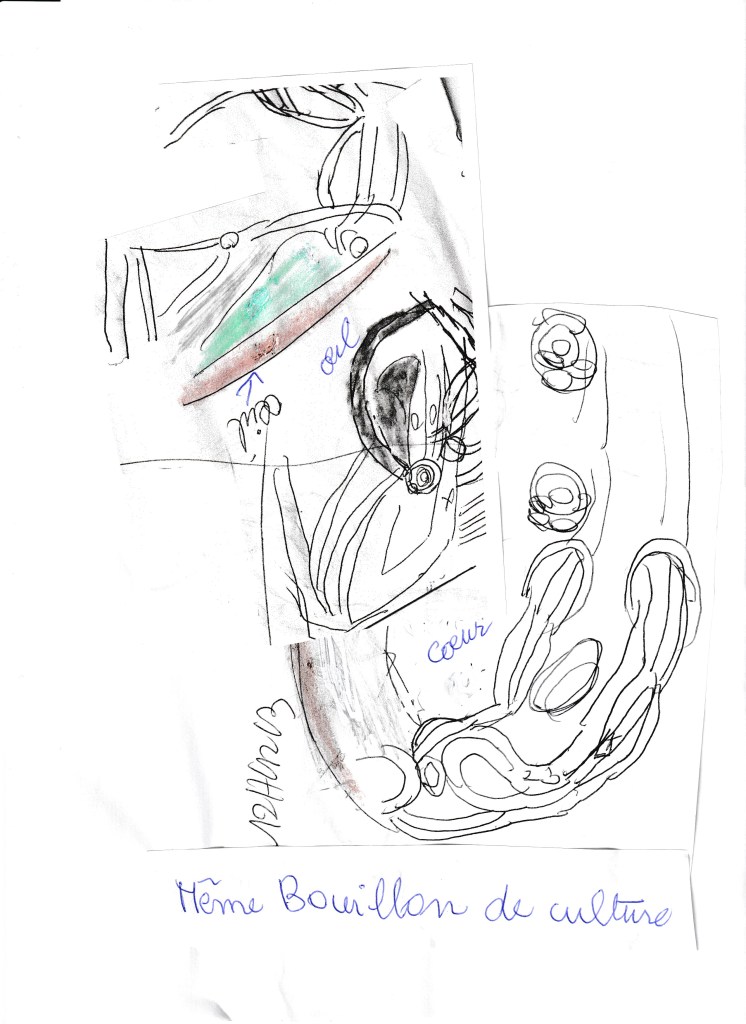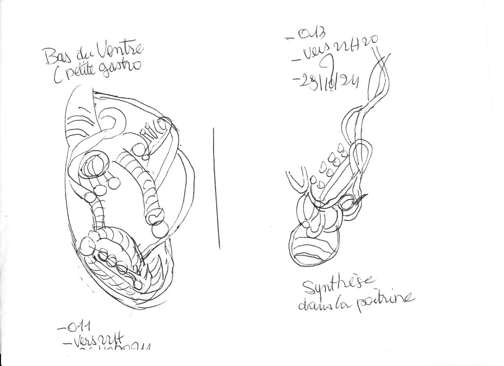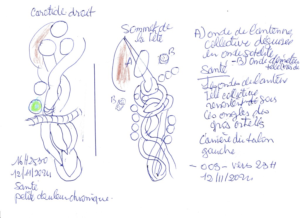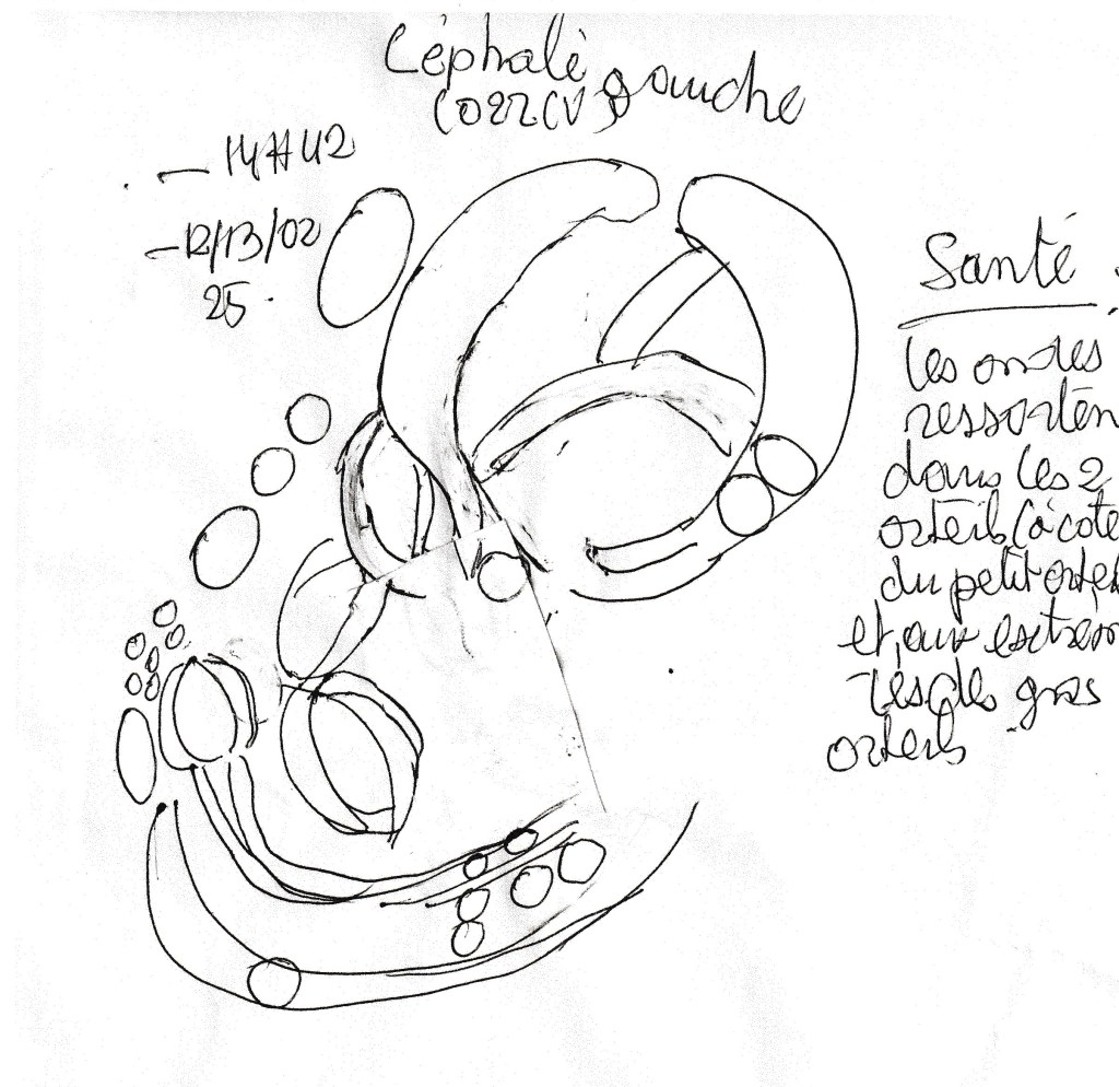 1)bruits électrique et ultrason les points vert et jaune se télescopent – 2)le bruit d’un cœur qui bat en faisant vrou vrou – 3) le bruit de l’enclume, le marteau sur ma tête – 4) battements d’un cœur qui grésille et mousseux. – 5 et 6) sifflement anesthésie l’oreille qui implose. – 11) les étoiles se déplacements comme des fusées, les sifflements font mal aux tympans. Ces ultrasons représente 1/4
