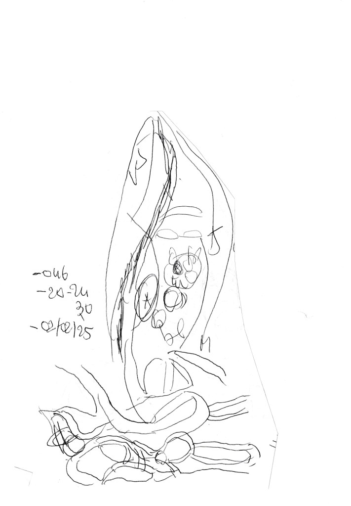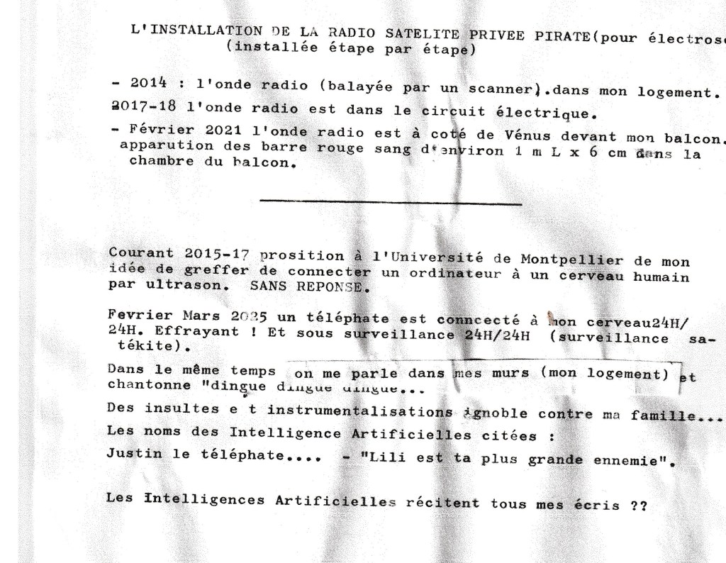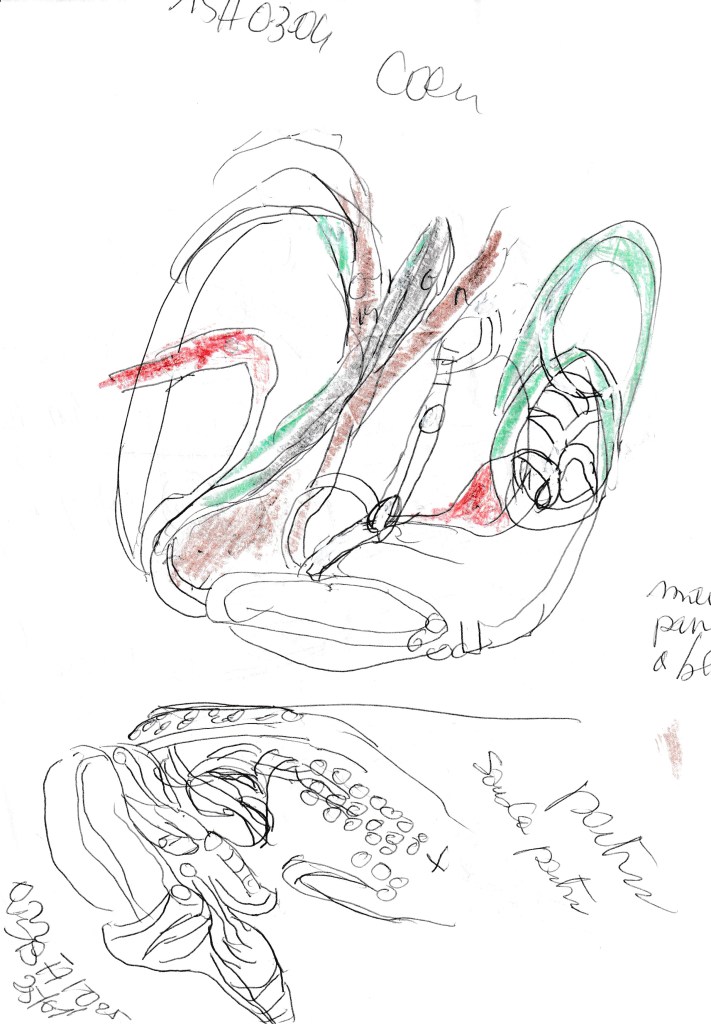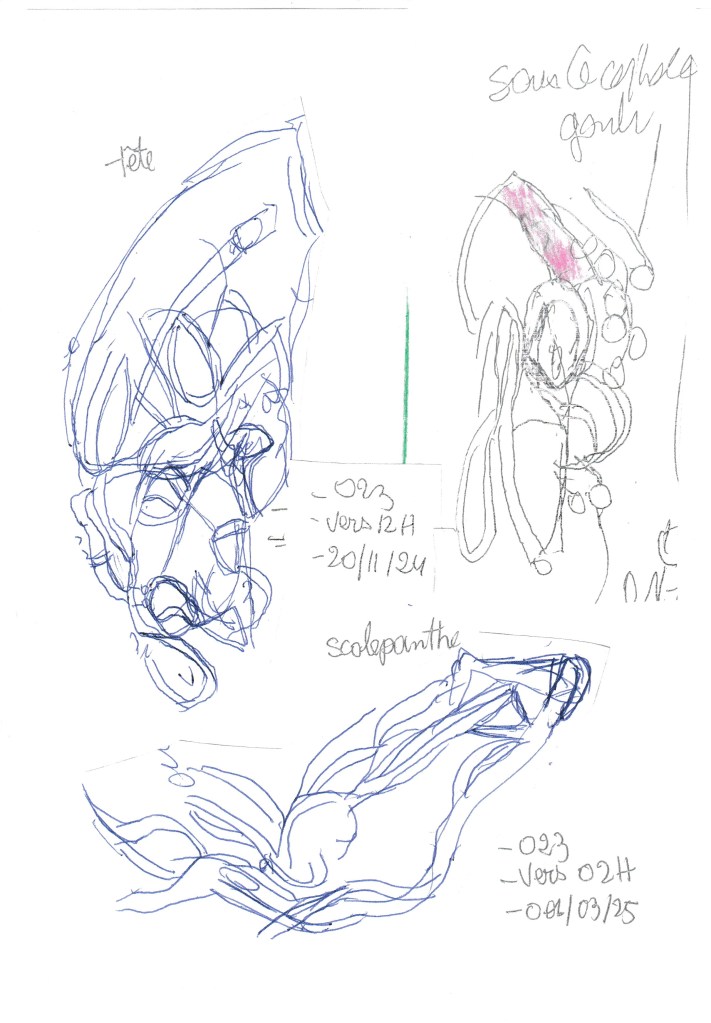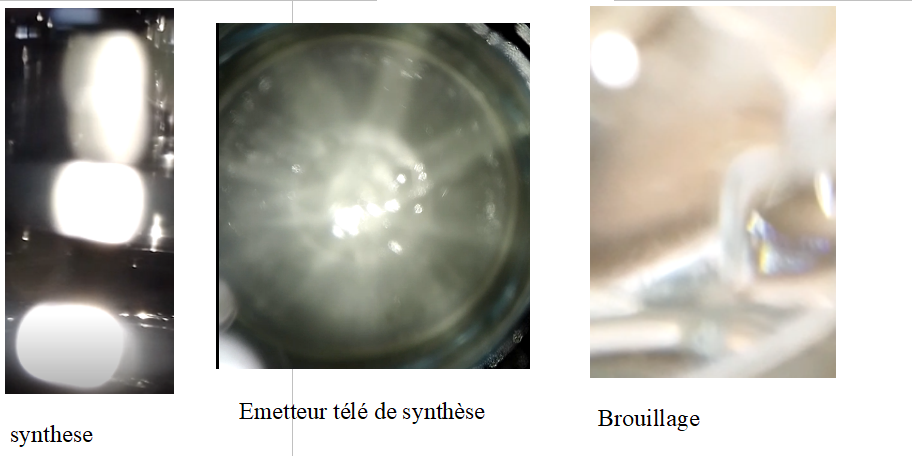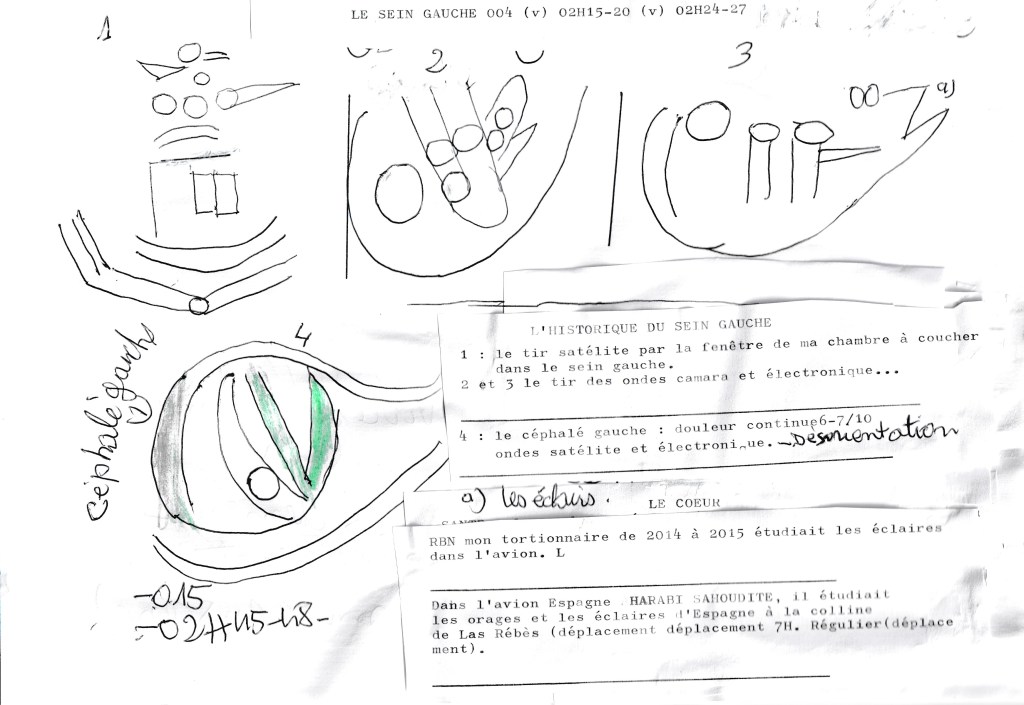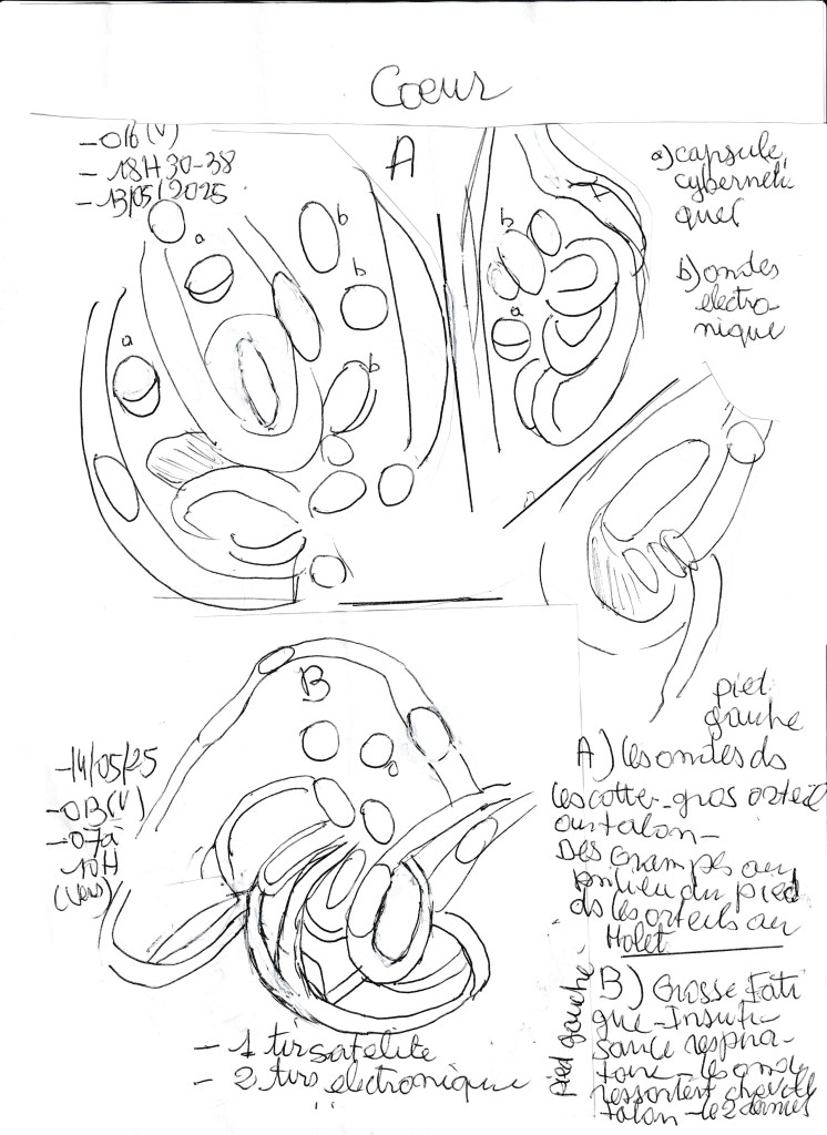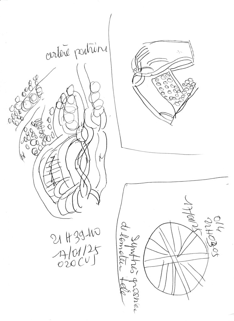 1)bruits électrique et ultrason les points vert et jaune se télescopent – 2)le bruit d’un cœur qui bat en faisant vrou vrou – 3) le bruit de l’enclume, le marteau sur ma tête – 4) battements d’un cœur qui grésille et mousseux. – 5 et 6) sifflement anesthésie l’oreille qui implose. – 11) les étoiles se déplacements comme des fusées, les sifflements font mal aux tympans. Ces ultrasons représente 1/4